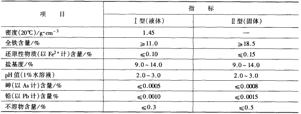 本产品为淡黄色无定型粉末,易溶于水。与其他无机絮凝剂相比,本品混凝性能优良,沉降速度快,净水效果好,不含铝、氯和重金属离子等有害物质,亦无铁离子的水相转移,无毒无害,安全可靠,具有显著的脱色、脱臭、脱水、脱油、除菌、脱出水中重金属离子、放射性物质及致癌物等多种功能,对COD、BOD和色度的去除率高达90%以上。适应水体pH较宽,为4~11。本品执行国家标准GB 14591--1993,本产品主要质量指标如下: